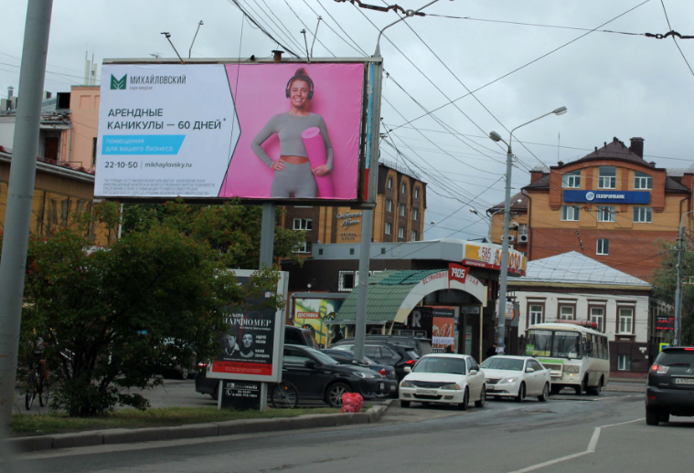 - Описание рекламной конструкции: Конструкция расположена на одном из центральных проспектов города. Это район застроек элитного жилья. Рядом находится Управление федерального казначейства Томской области, ряд торговых центров: «Марка», «Intui», «Подиум» и т.д. Также совсем недалеко расположен стадион «Труд». Оживленный пешеходный поток, перекресток , пешеходный переход.