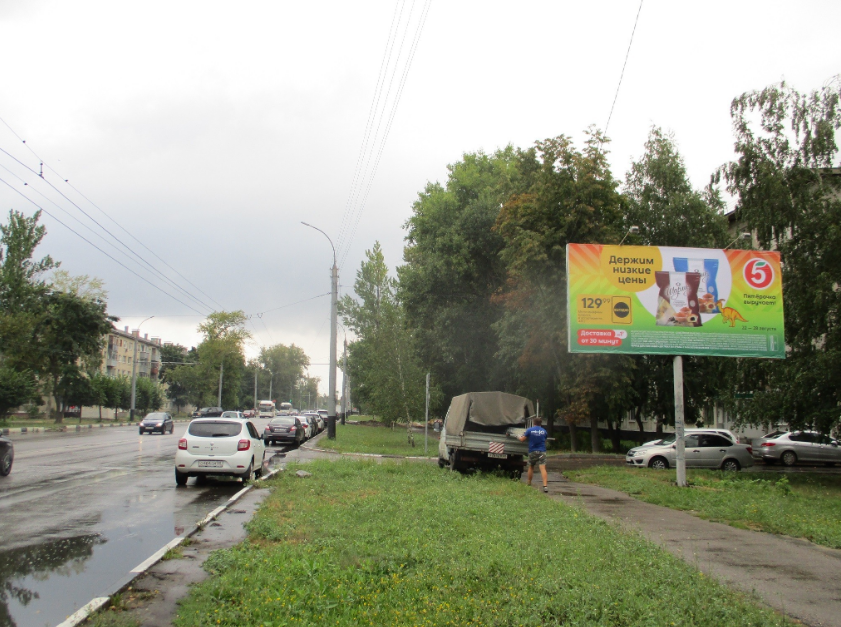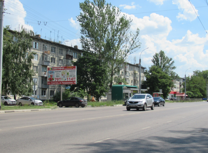 - Описание рекламной конструкции: Рядом находятся: крупный жилой район, остановка, светофор, пешеходный переход, продуктовые магазины.