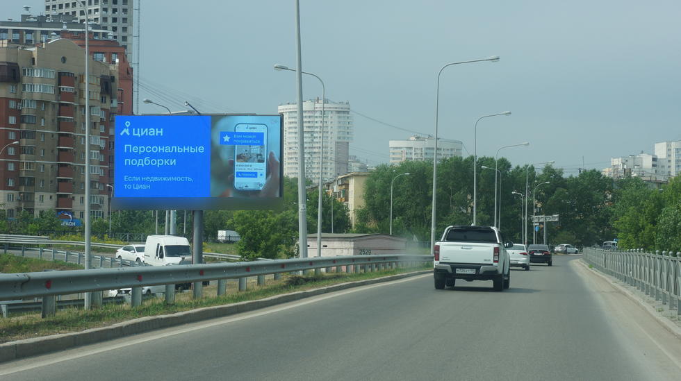 Крупная транспортная развязка, съезд с обеъздной дроги в сторону центра, рядом расположен ТЦ Леруа Мерлен. В центр. Ролик 5 сек., блок 60 сек., время работы экрана: 00:00-00:00, кол-во часов работы: 24, кол-во выходов в сутки: 1440