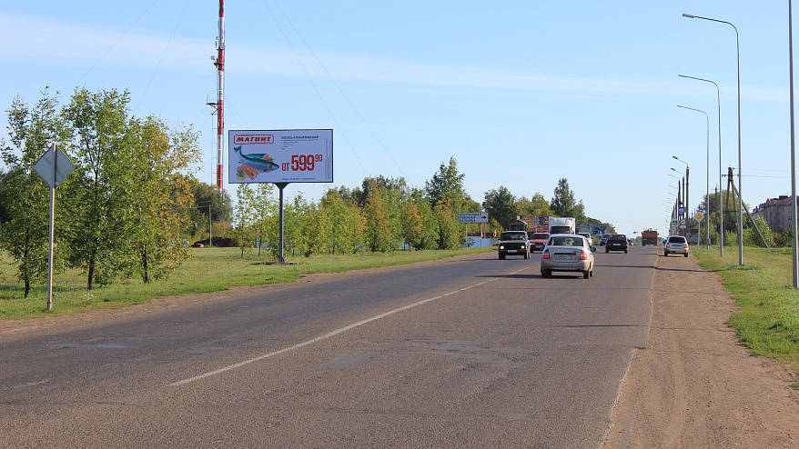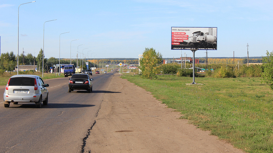 - Описание рекламной конструкции: Первый щит на въезде в город Чистополь из Казани. Рядом новый многоэтажный жилой массив и котеджная застройка.