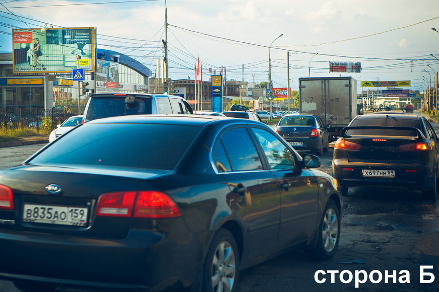 Движение по ходу транспорта, светофор, пересечение с Бродовским трактом, мебельный центр "Баумол" , выезд из города, офисные здания, автомобильные салоны, направление в стороны ул.Васильева, по направлению к Индустриальному р-ну и м/р Крохалевка
