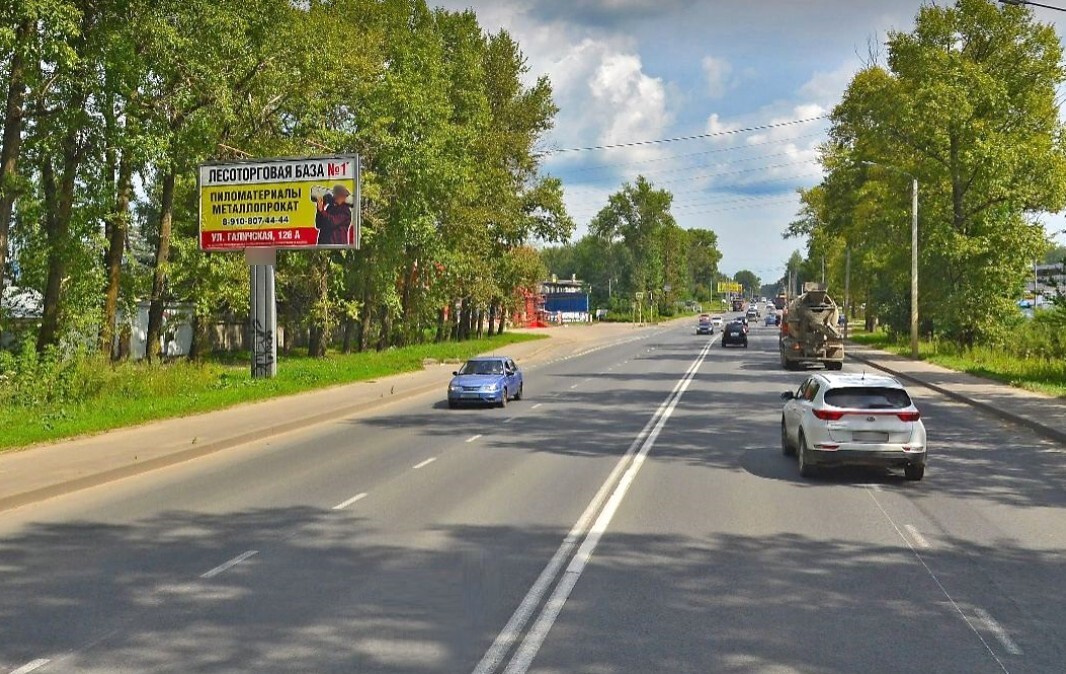 - Описание рекламной конструкции: Въезд в город по Галичскому тракту, оптовые базы. Направление: в сторону ул. Юрия Смирнова.