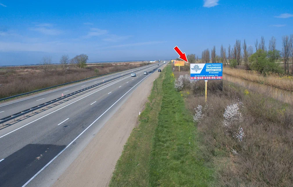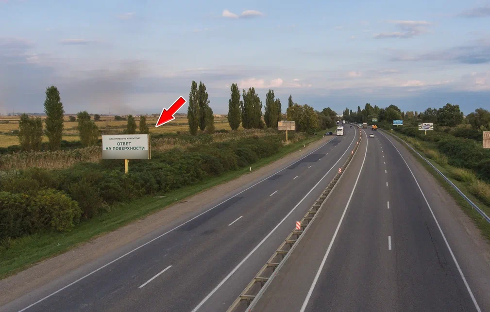 - Описание рекламной конструкции: Щит расположен между трассой М4 и Краснодар-Новороссийск. На подъезде к трассе Краснодар-Новороссийск