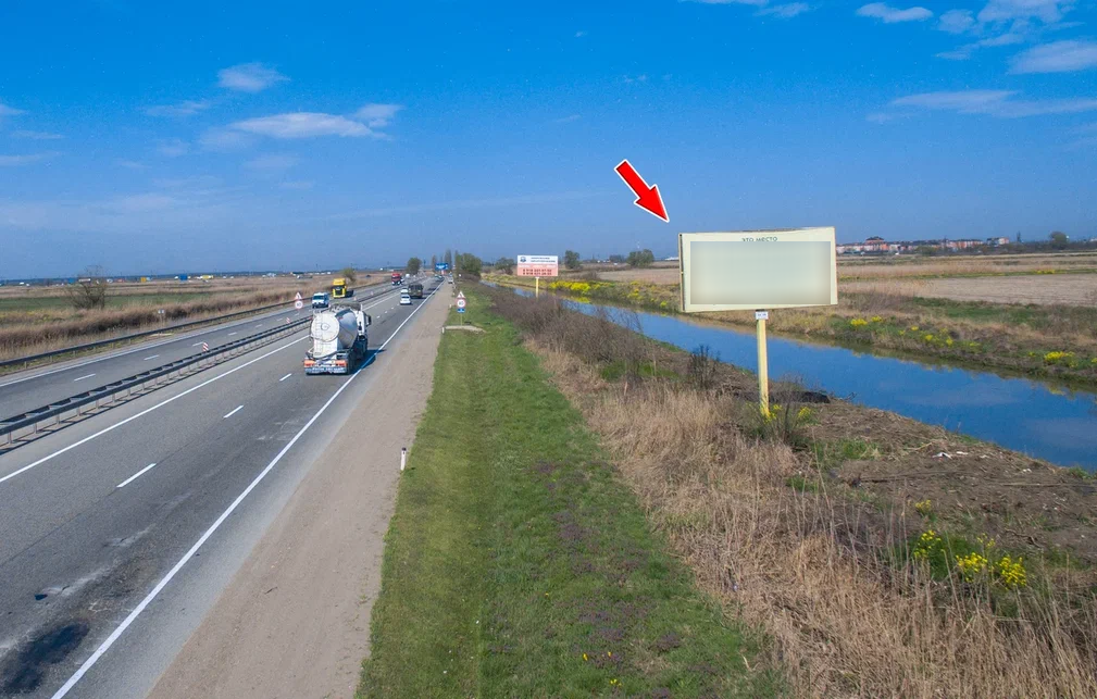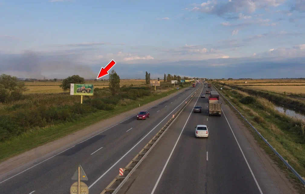 - Описание рекламной конструкции: Щит расположен между трассой М4 и Краснодар-Новороссийск. На подъезде к трассе Краснодар-Новороссийск