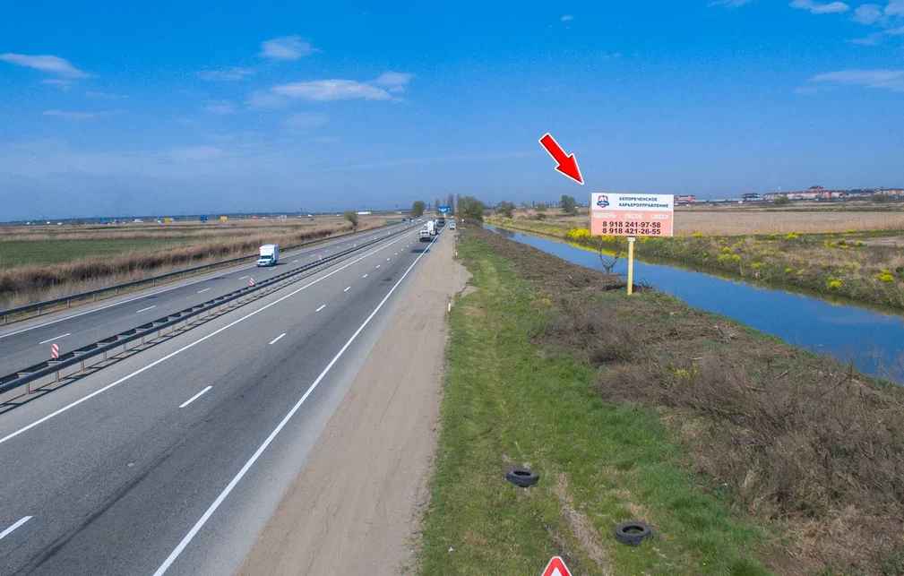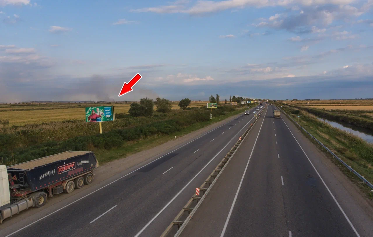 - Описание рекламной конструкции: Щит расположен между трассой М4 и Краснодар-Новороссийск. На подъезде к трассе Краснодар-Новороссийск