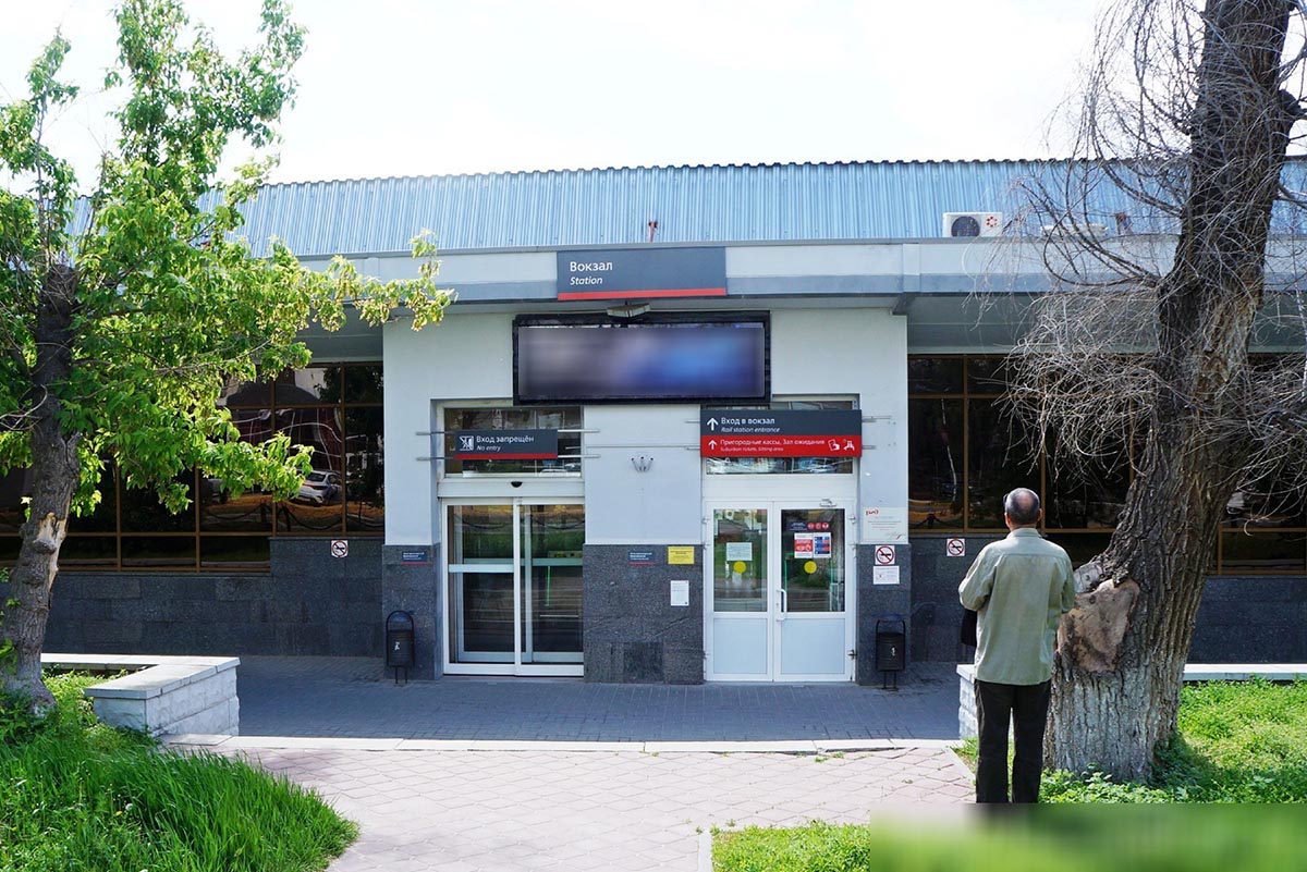 Фотография рекламного носителя, тип: Нестандартный билборд, адрес: Привокзальная пл., д.1, пригородный вокзал, над входом, Волгоград, Волгоградская область, Россия. Сторона А №987246