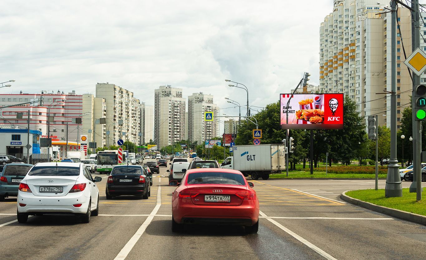 - Описание рекламной конструкции: Рядом находятся Митинский радиорынок, автосалон "Volvo", кафе "Мир шашлыков", АЗС "Shell", "Лукойл"