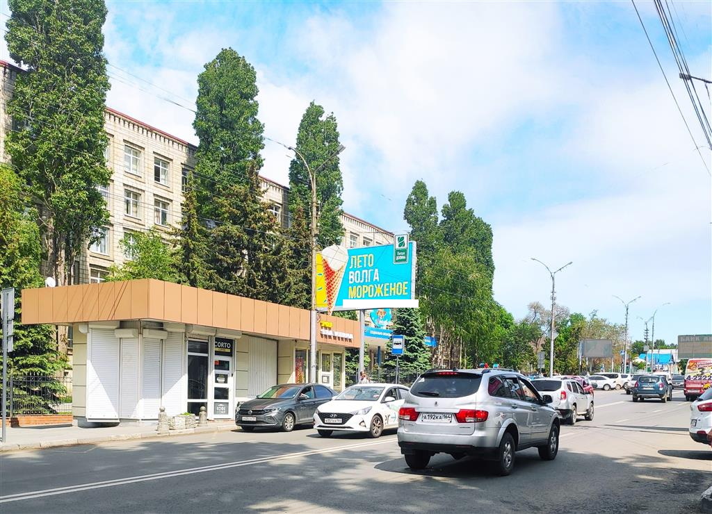 - Описание рекламной конструкции: Двусторонняя статичная освещенная конструкция. Установлена на ул. Радищева. Рядом расположены супермаркет "Социализм", Саратовский Государственный Экономический Унивеситет, магазины.