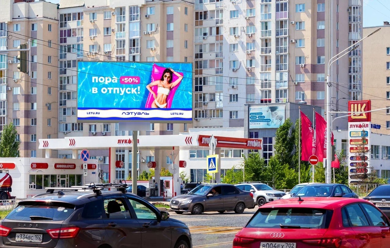 В город. Ролик 5 сек., блок 60 сек., показов в блоке 1, количество показов в сутки 1 440, время работы 24 ч. Разрешение экрана 864х432 px