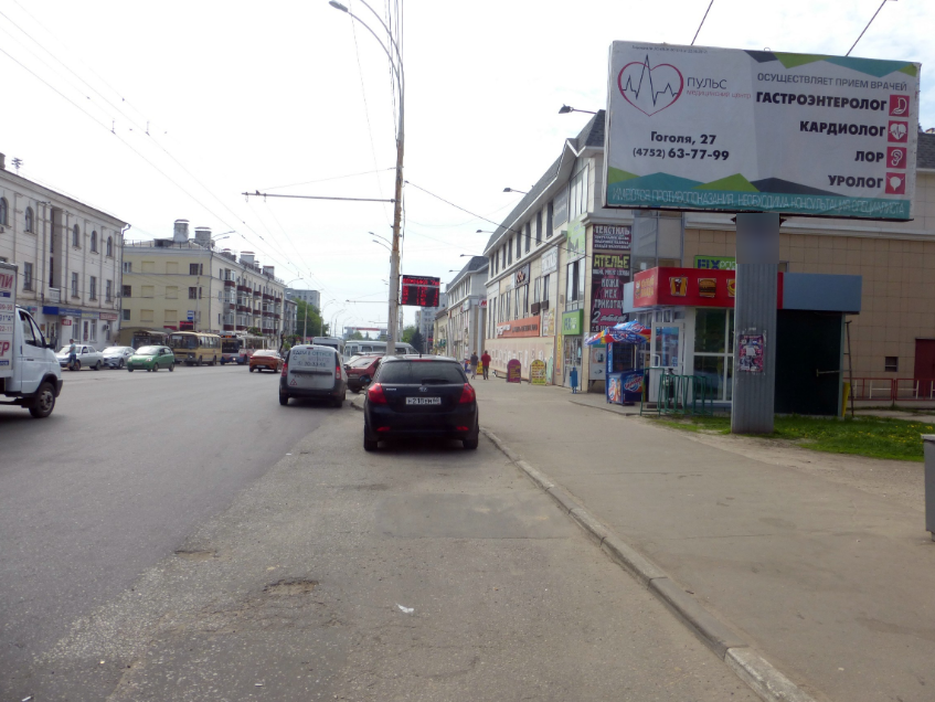 - Описание рекламной конструкции: Рядом находятся: универсам «Магнит», сетевой магазин цифровой и бытовой техники «DNS», городская поликлиника, учебный корпус Тамбовского государственного университета им. Г.Р. Державина, перекресток, остановка общественного транспорта.