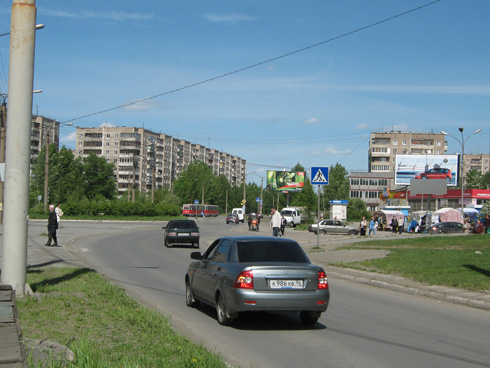- Описание рекламной конструкции: Это место характеризуется большим скоплением народа благодаря наличию рядом нескольких остановок, расположению вблизи универсама и недавно отстроенного многоэтажного рынка. Конструкция представляет собой трехгранник, стороны которого хорошо открыты для обзора. Сторона 222 смотрит на ул. Зари и на остановочный комплекс.