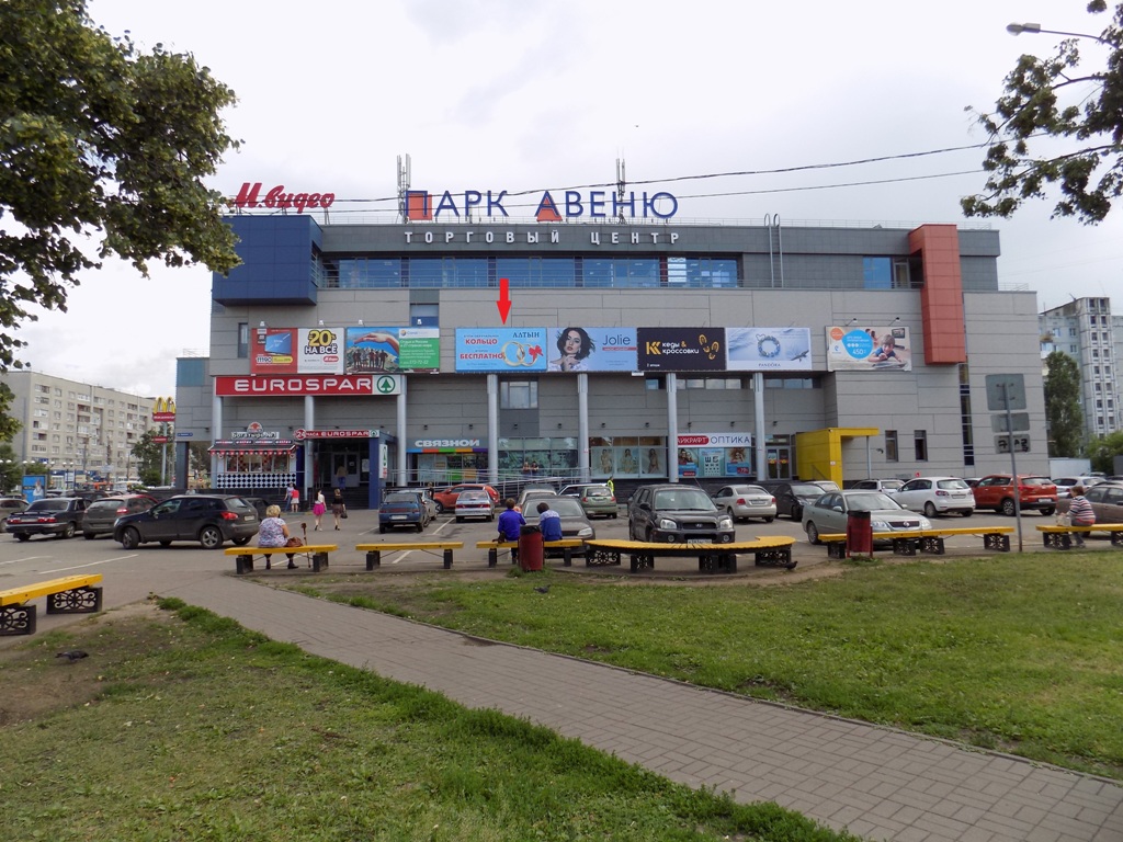 - Описание рекламной конструкции: Центр Автозавода, пересечение с пр.Ленина и пр. Октября, движение в сторону Аэропорта. Щиты расположены на здании ТЦ "Парк Авеню"( Магазины М-Видео, ЕВРОСПАР и др.