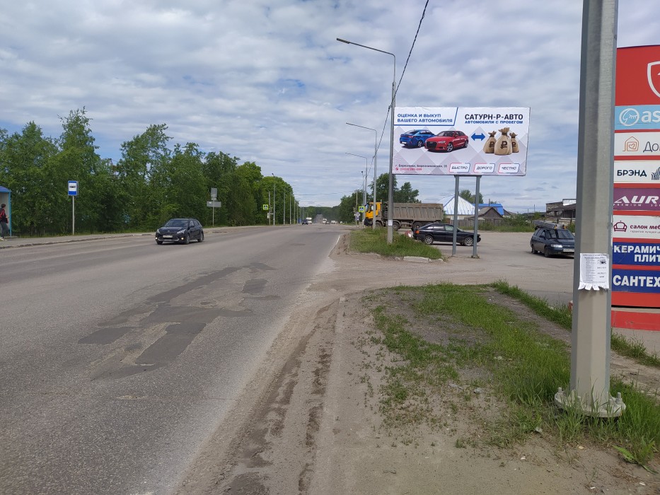- Описание рекламной конструкции: Рекламная конструкция расположена на автодороге, соединяющей две части города: северную и южную (дорога ведет на выезд из города в сторону Красновишерска), возле автобусной остановки