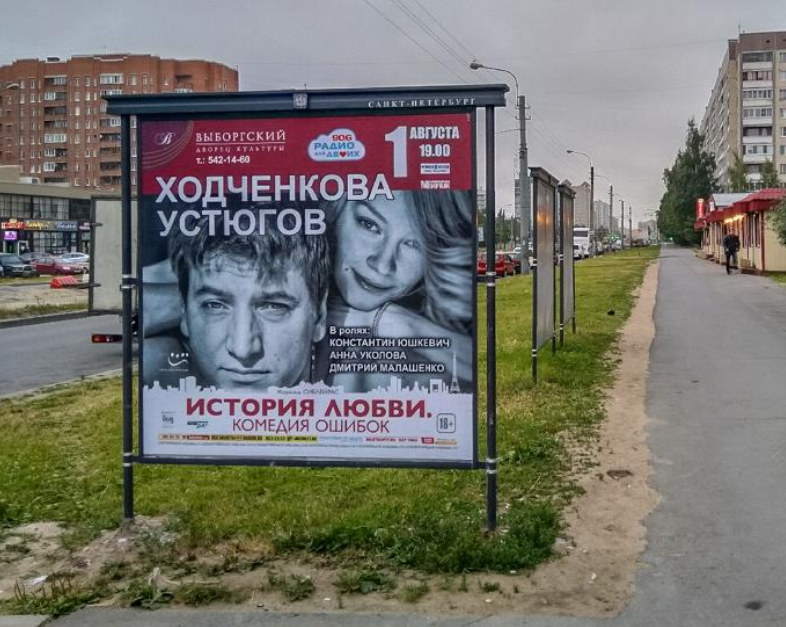 Фотография рекламного носителя, тип: Афиша 1.75x1.8, адрес: Авиаконструкторов пр-т., д.11, корп. 2, установка 1, Санкт-Петербург, Россия. Сторона A №1099853