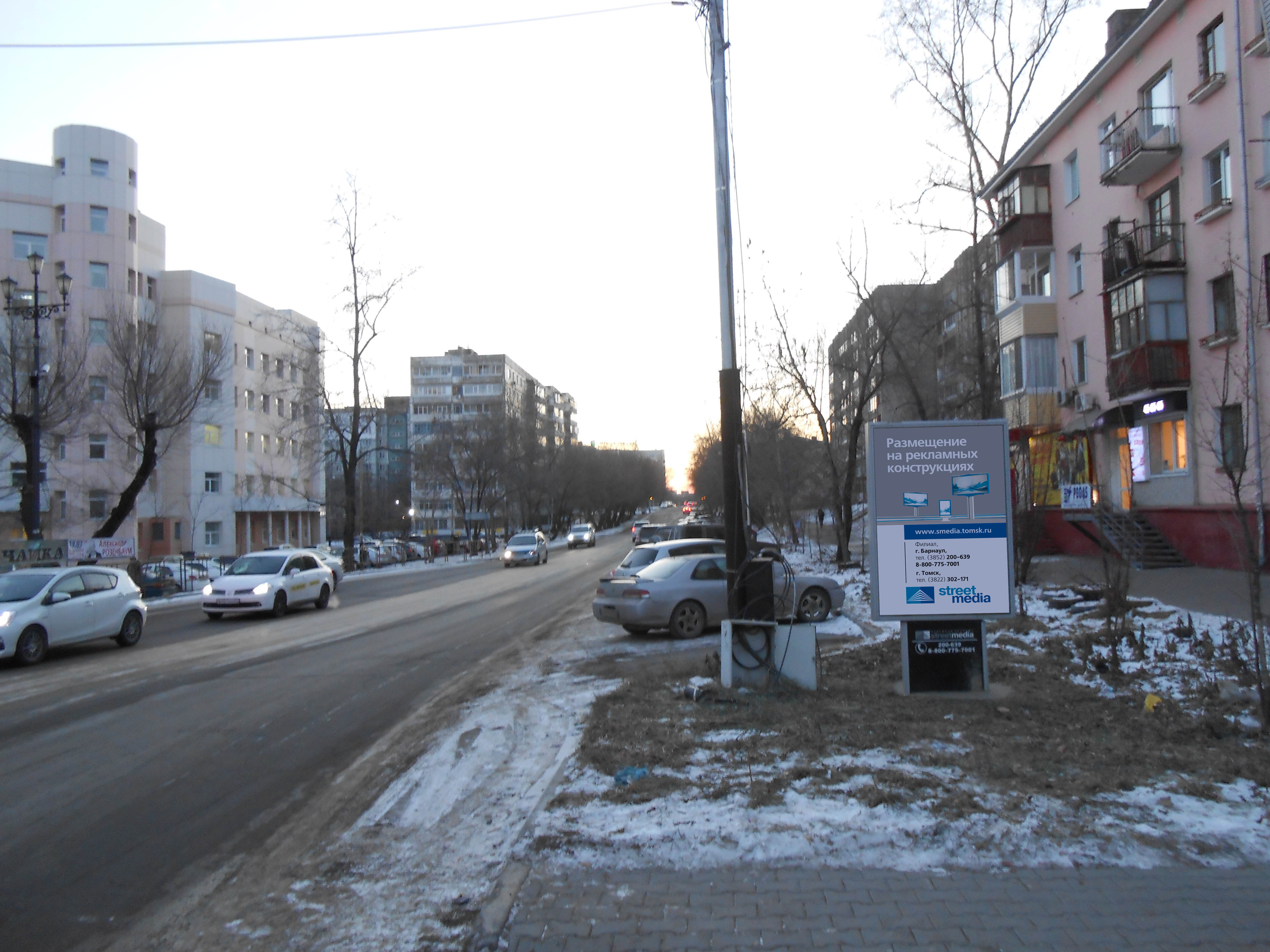 - Описание рекламной конструкции: Расположен в центре города, на перекрестке, рядом автомагазин, свадебная студия, ритуальное агентство, газета "Амурский Меридиан", агентство недвижимости, бюро юридических услуг, парикмахерские, рекламное агентство, ЧОП, салон кухонной мебели, DNS, магазин отделочных материалов, автосервис.