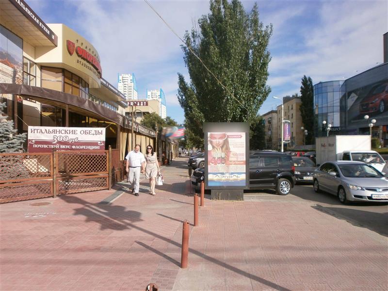 - Описание рекламной конструкции: Двусторонняя статичная освещенная конструкция. Рекламная конструкция расположена по ул.Калинина, в 10м до пересечения с ул.Рабоче-Крестьянская. Конструкция расположена рядом с остановкой общественного транспорта "Пл.Чекистов". На этом перекрестке находятся: офисное здание выставочного центр "Меркурий", ресторан "Византия". По ул.Калинина находятся магазины офисной мебели, паспортный стол.