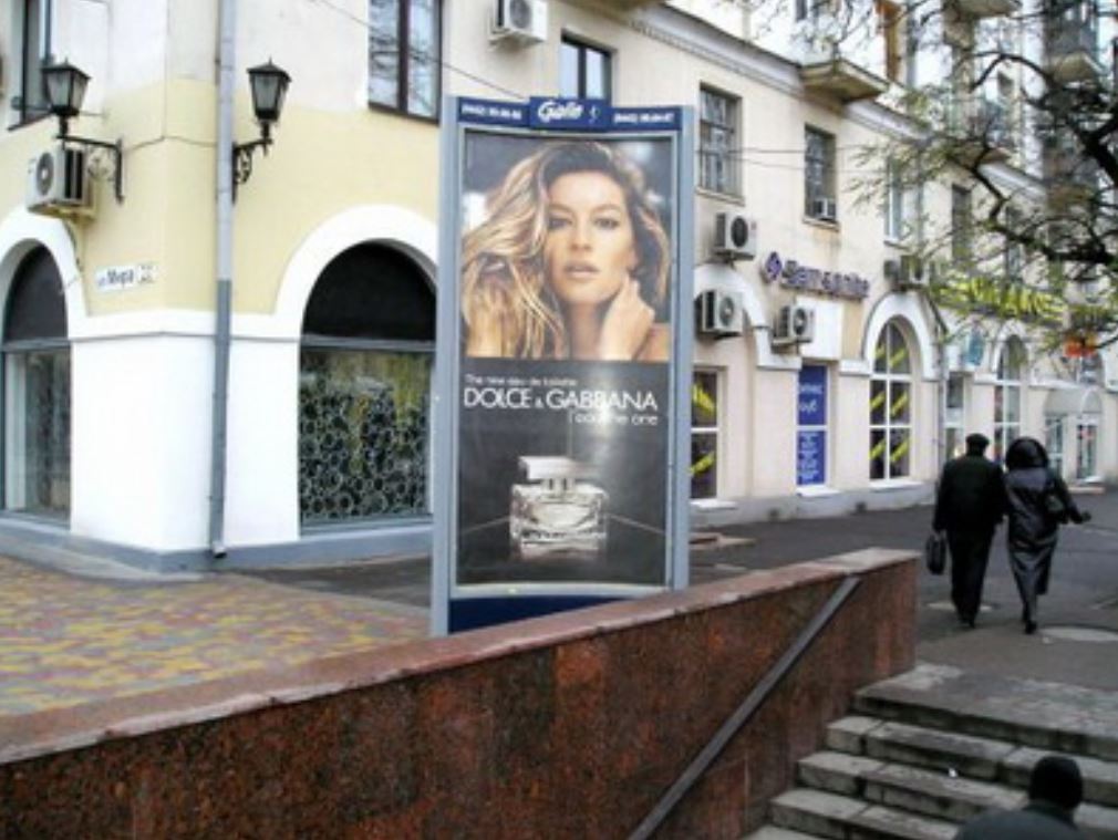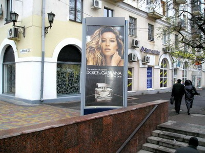 - Описание рекламной конструкции: Трехсторонняя статичная освещенная конструкция. Расположена в центре города на ул. Комсомольской. Рядом находится сеть магазинов, Центральный рынок, отделения банков.