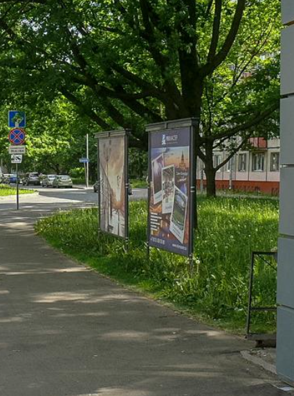 Фотография рекламного носителя, тип: Афиша 1.75x1.8, адрес: Космонавтов пр-т., д.13 Х Бассейная ул., установка 2, Санкт-Петербург, Россия. Сторона A №1100271