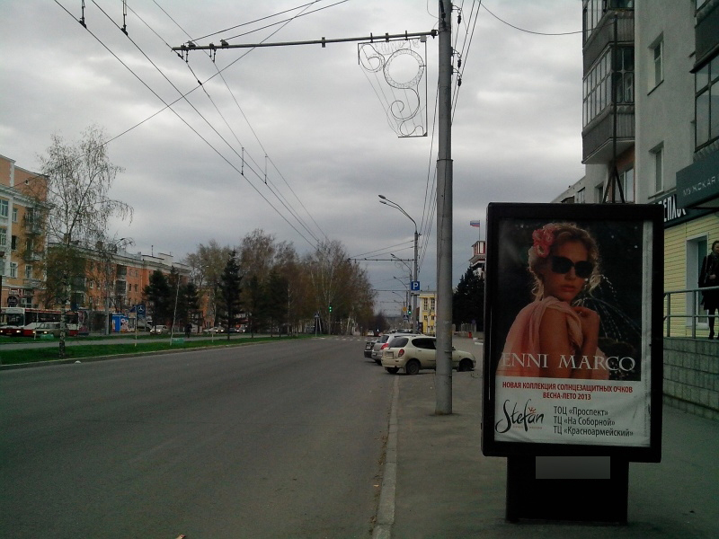 - Описание рекламной конструкции: Рекламный носитель расположен на пр.Ленина, рядом магазин цветов "Тюльпан" и сеть магазинов одежды "Пеплос", интенсивный пешеходный поток, хорошо просматривается с проезжей части.