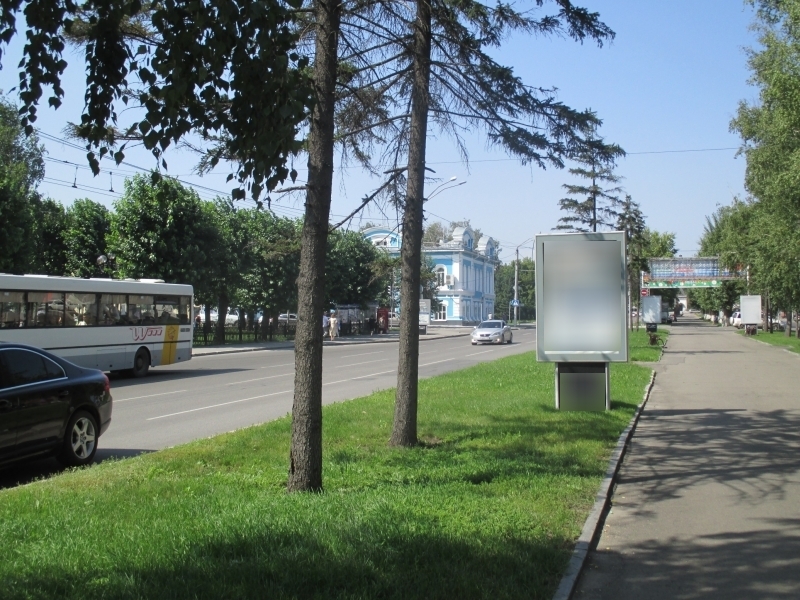 - Описание рекламной конструкции: Расположен на пересечении проспекта Ленина и улицы Пушкина. Напротив управления Юстиции по Алтайскому краю. Неподалеку расположен сквер - традиционное место отдыха Барнаульцев.