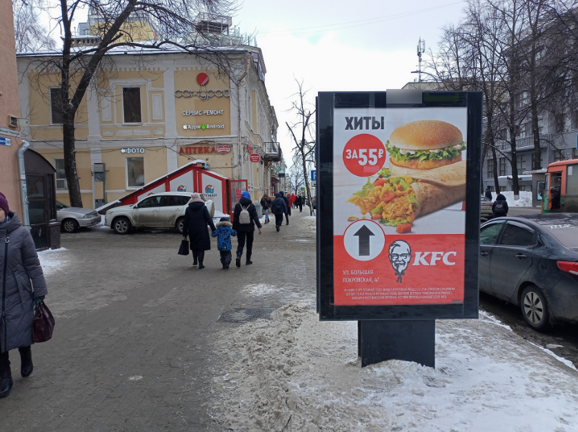 - Комментарий к адресу: Ростелеком. Конструкция расположена по пути на главную пешеходную улицу - Большую Покровскую, которая является местом притяжения людских масс в вечерние часы, выходные дни, увеселительные заведения и точки общепита на всём протяжении улицы
