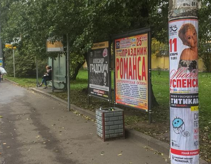 Фотография рекламного носителя, тип: Афиша 1.75x1.8, адрес: Старо-Петергофский пр., д.27, наб. Обводного канала, установка 2, Санкт-Петербург, Россия. Сторона A №1101024