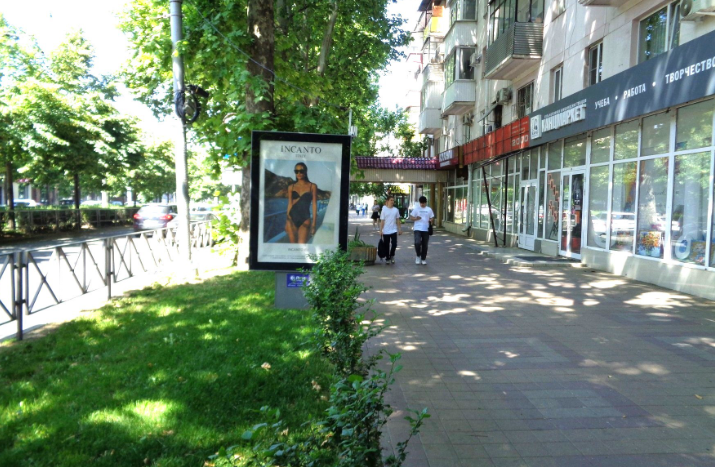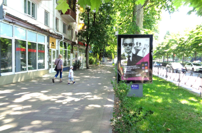 - Описание рекламной конструкции: Двусторонняя статичная конструкция расположена на улице Ставропольская, одной из важнейших магистралей города. В непосредственной близости расположены магазины Агрокомплекс, Космотека, Пинта, Я сама, салон мебели Астарта, Идеа-Банк, фитнес клуб Форма-Fit.