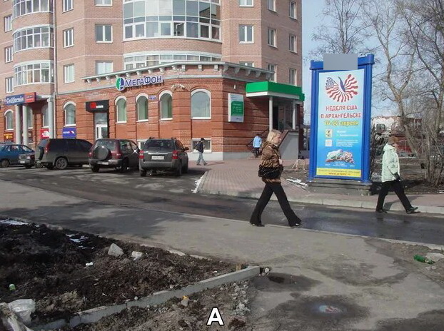 Фотография рекламного носителя, тип: Пиллар 3x1.4, адрес: Троицкий пр-т. Х Володарского ул., Архангельск, Архангельская область, Россия. Сторона АВС №819765
