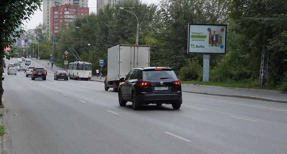 - Описание рекламной конструкции: Регулярные пробки в час-пик (4-х полосное односторонне движение). Рядом находятся: ЖК "Атриум", апартаменты "Огни Екатеринбурга". ТС "Монетка"