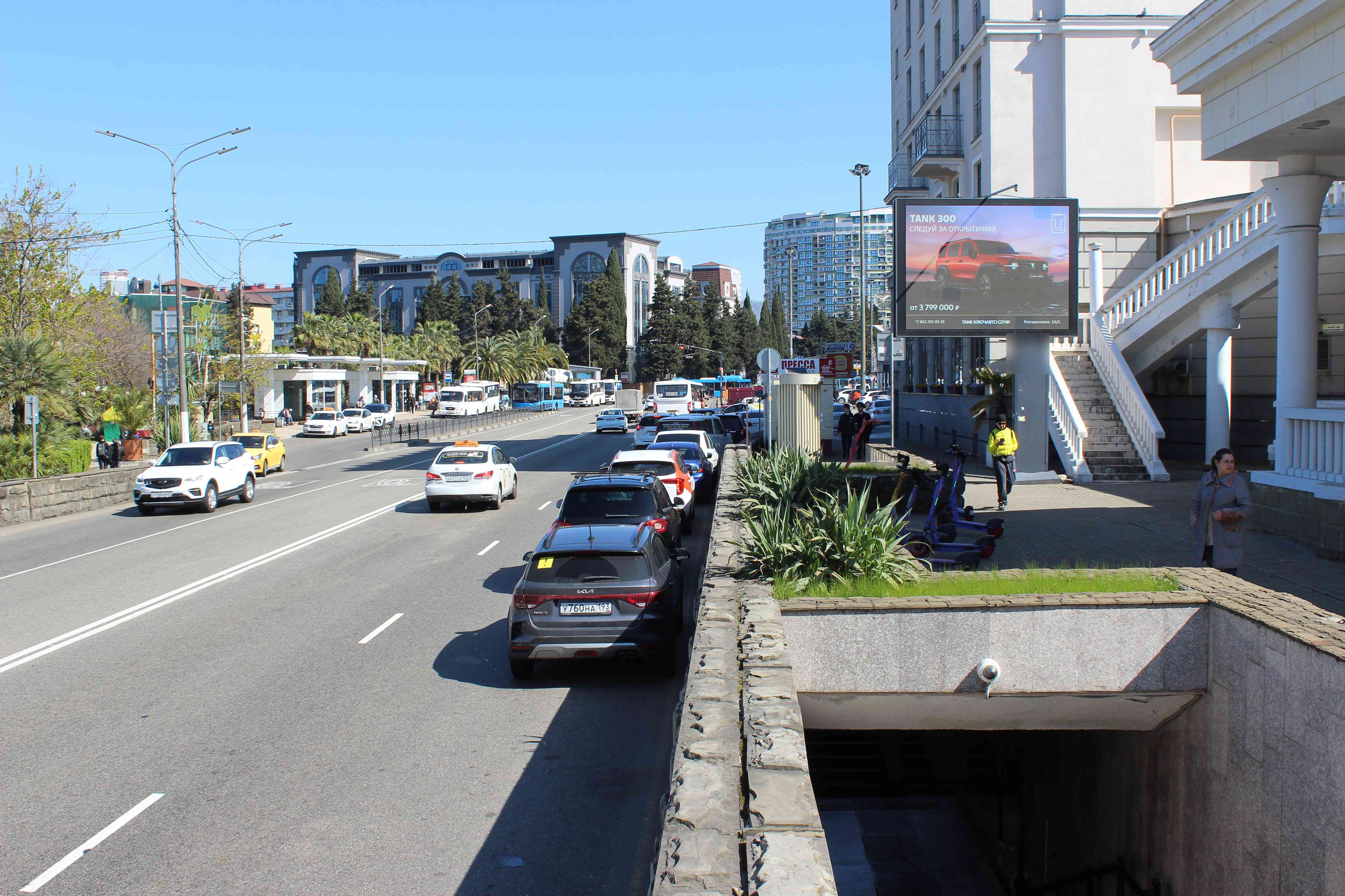 - Описание рекламной конструкции: Ситиборд цифровой 2.7х3.7. Расположена на ул. Горького - одной из транспортно-пешеходных артерий города, ведущей от Морского порта и монумента Михаила Архангела к крупным жилым массивам. Установлена между пешеходным переходом и гостинецей "ПАРК ИНН" в непосредственной близости от Ж/Д вокзала г. Сочи. Далее по направлению движения транспорта ж/д, авто- вокзалы, жилые массивы Завокзальный, Ареда, Макаренко, КСМ. Плотные транспортный и пешеходный потоки. Постоянные пробки.