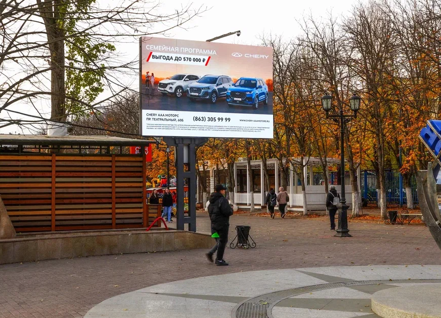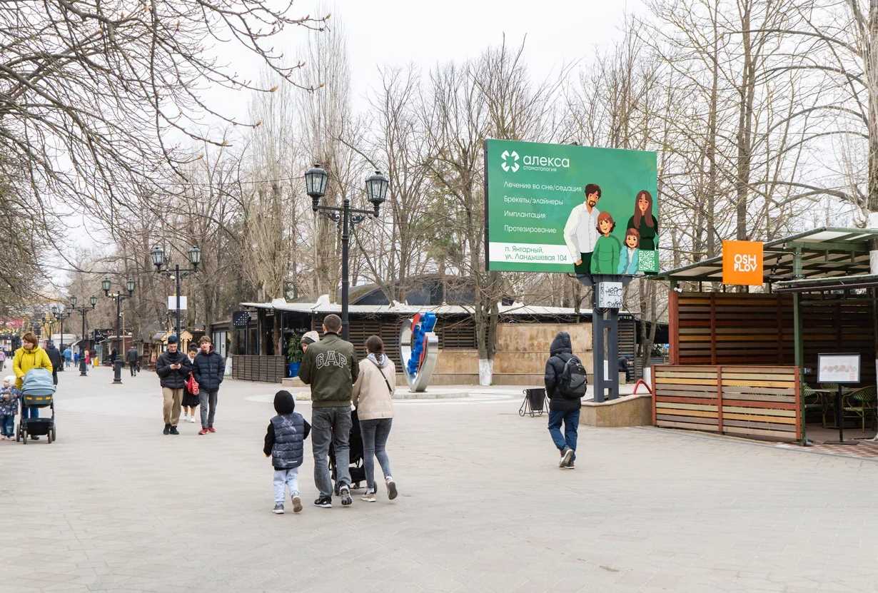 - Описание рекламной конструкции: Видеоэкран формата digital city board. Расположен в прогулочной зоне городского парка "Сказка" в мкр. Западный города Ростова-на-Дону. Благодаря удачному расположению на пересечении центрального входа на аллею и парк аттракционов экран просматривается всеми гостями парка и не остается незамеченным. А благодаря длительному контакту с полотном размещение длительных видеороликов (от 10 секунд) будет только преимуществом.