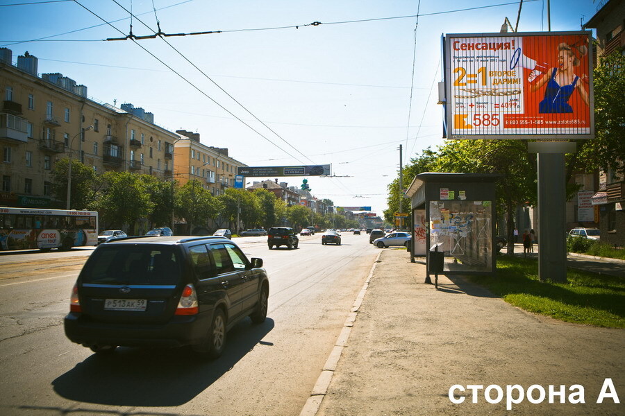 - Описание рекламной конструкции: Большой поток пешеходов и автотранспорта (в том числе общественного). Перекресток с ул. Ким . Рядом БЦ "Инженер"," МДМ Банк", ТЦ "Метелица", "Ренесанс Кредит", инвестиционная компания "Активные Акции", телеканал ТНТ-Пермь, харчевня "Длинный нос", кафе "Печки-лавочки", множество торговых точек: "Форвард" (спорт-товары), "Диамант" (ювелирный магазин), DNS (супермаркет цифровой техники) и многое другое. Сторона Б - в сторону Цирка, салоны сот. связи "Евросеть", Связной, Билайн, Ростелеком, Мегафон. Цирк, планетарий, центральный маг-н Виват, семья,добрыня, Пятерочка,джинсовый дом, ТД "Знания", Почтовое отделение, Центральное отделение "УралСвязьИнформ",Маг-н велосипедов "Forward", Визовый центр,зоомагазин "Бонифаций", больничный городок