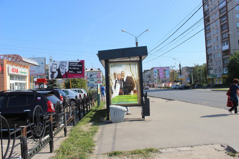 Фотография рекламного носителя, тип: Остановка 1.8x1.2, адрес: Циолковского пр-т., Центральный Универмаг, Дзержинск, Нижегородская область, Россия. Сторона Б №1043896