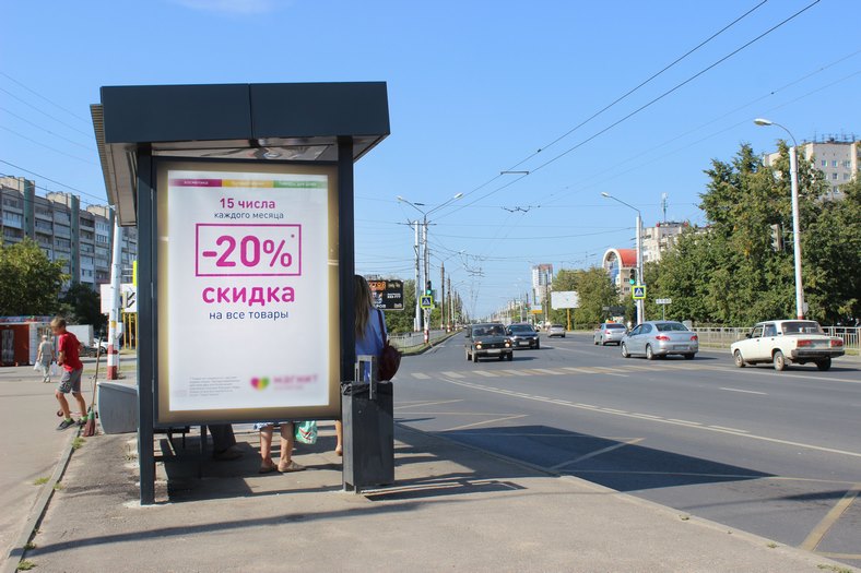 Фотография рекламного носителя, тип: Остановка 1.8x1.2, адрес: Циолковского пр-т., д.69, Дзержинск, Нижегородская область, Россия. Сторона Б №1043904