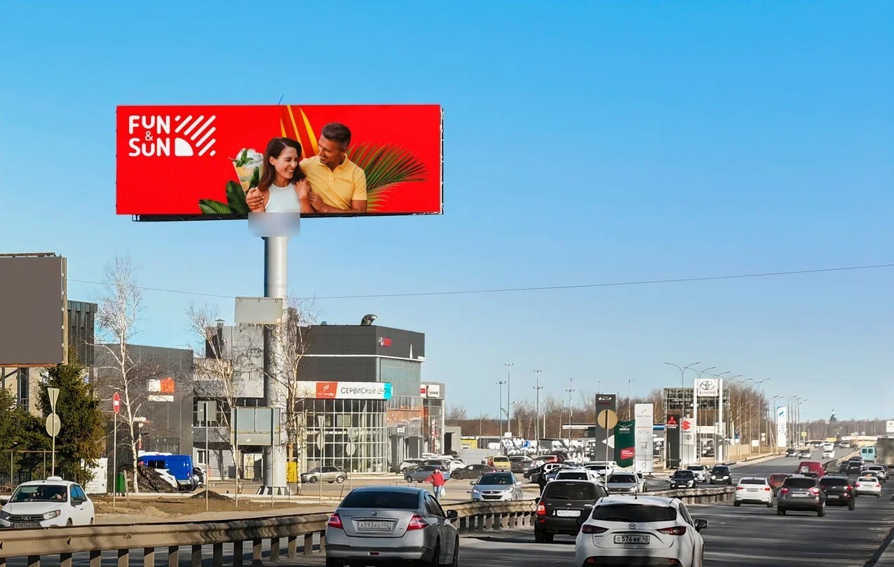 В город. Ролик 5 сек., блок 60 сек., показов в блоке 1, количество показов в сутки 1440, время работы 24 ч. Разрешение экрана 1440х480 px