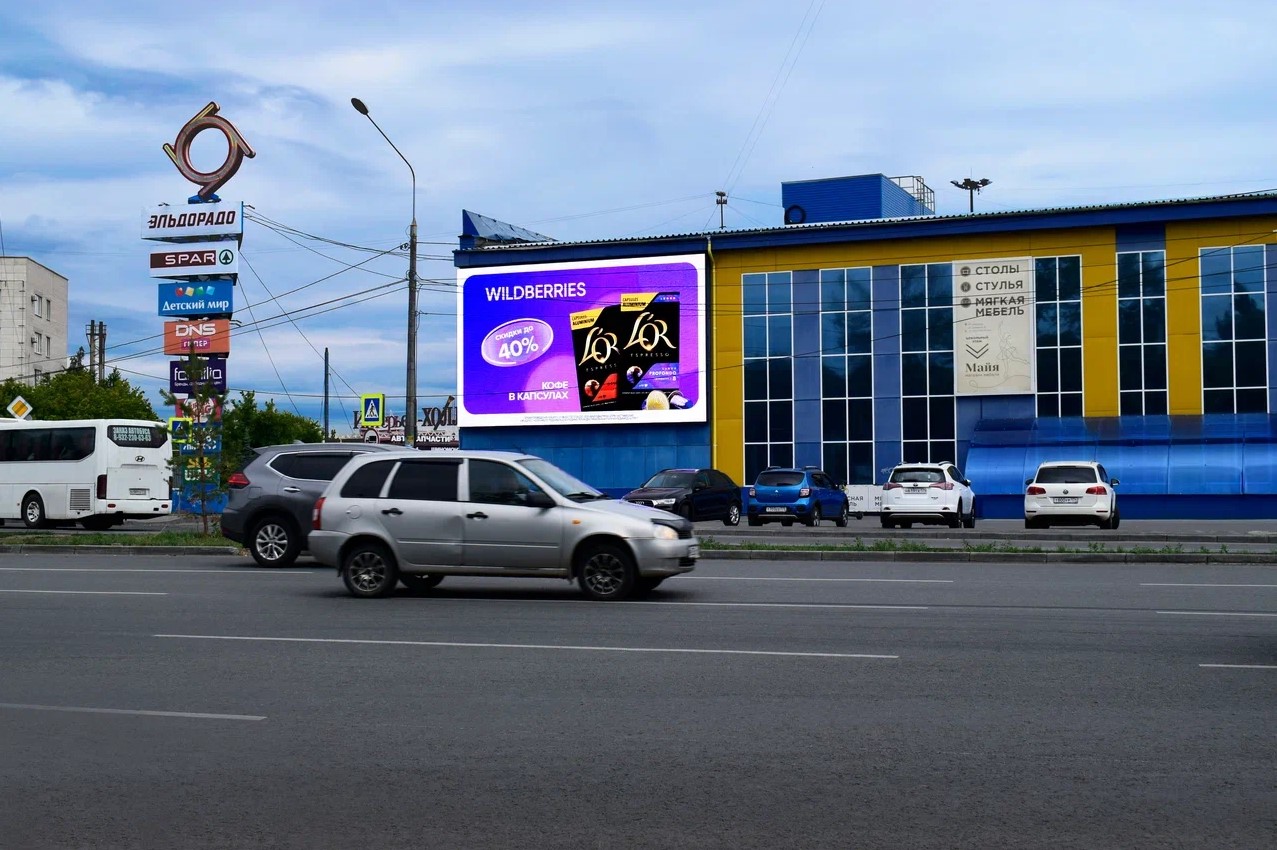 Ролик 5 сек., блок 5 мин., 288 выходов в день, время работы 24 часа. Медиаэкран установлен на фасаде мебельного корпуса ТК «Кольцо», расположенного на пересечении улицы Дарвина и улицы Блюхера, на основном на парковку у центрального входа в торговый комплекс. Преимуществом данного экрана является то, что он находится на основном въезде в город с федеральной трассы М5. Длительность визуального контакта, достигается за счет того что, на данном участке установлен светофор, и все въезжающие в город автомобили делая остановку, имеют хороший, длительный обзор рекламы, транслируемой на данном экране. По мимо всего вышеперечисленного, данное местоположение привлекательно тем что экран расположен на пути следования к торговому строительному центру ТК «Маяк». В непосредственной близости так же расположены, автосалоны, кондитерская фабрика, бизнес центры и административные здания, автомастерские, ПФР и многие другие места с высоким автомобильным и пешеходным трафиком.