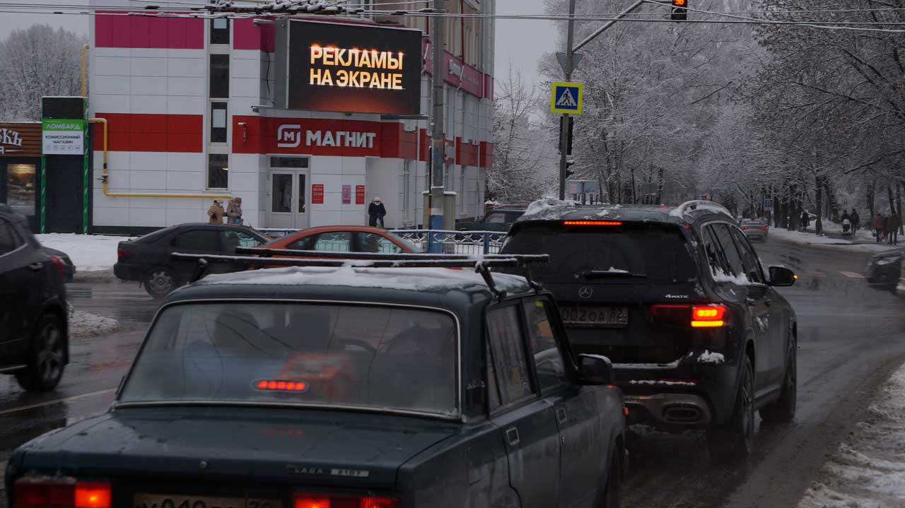 блок 3 мин., ролик 10 сек., 1 выход в блоке, 330 выходов в сутки. Время работы: с 6.30 до 23.00. На фасаде торгового центра МАЯК. При движении по по улице Костычева от пер. Пилотов и по ул. Крахмалева от ул. Красноармейской.