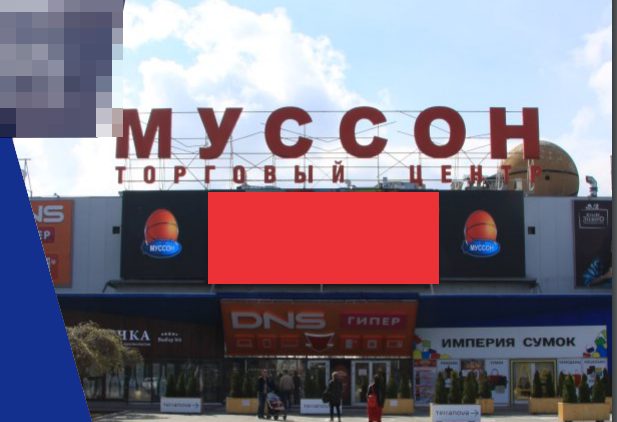 - Описание рекламной конструкции: 5Х9 метров, рекламный блок 5 минут. Экран расположен на фасаде, над главным входом в ТРЦ.
