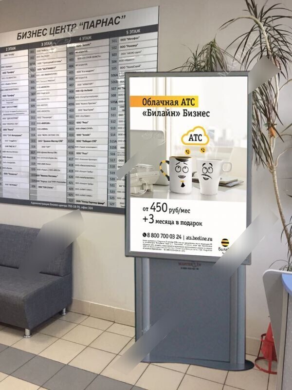 Фотография рекламного носителя, тип: Диспенсер листовок, адрес: Бизнес-центр «Парнас», Домостроительная ул., д.4, лит.А, Санкт-Петербург, Россия. Сторона/вариант №830422