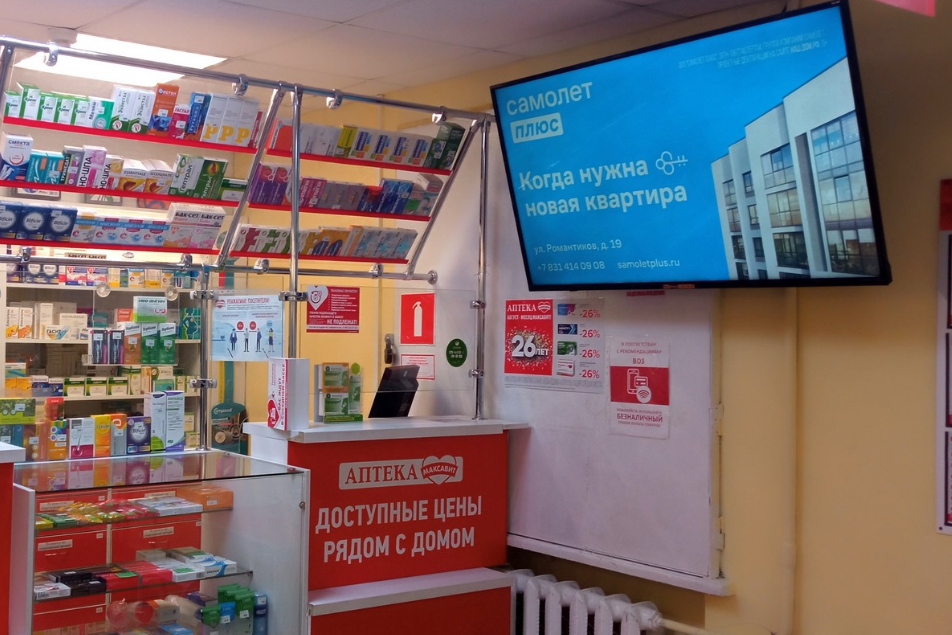 Фотография рекламного носителя, тип: Видеоэкран, адрес: Аптека «Максавит», Щербинки-1 мкн., д.11, Нижний Новгород, Нижегородская область, Россия. Сторона/вариант №872842